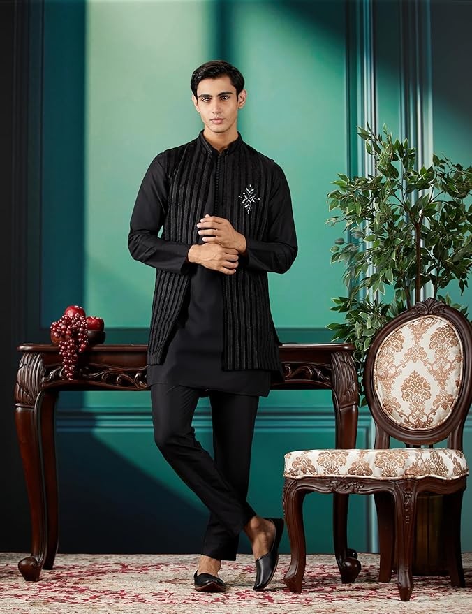 • Package content: 1 Kurta: 1 Nehru Jacket: 1 Trouser | Fabric: Blended | Pattern: Sheer