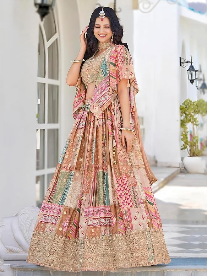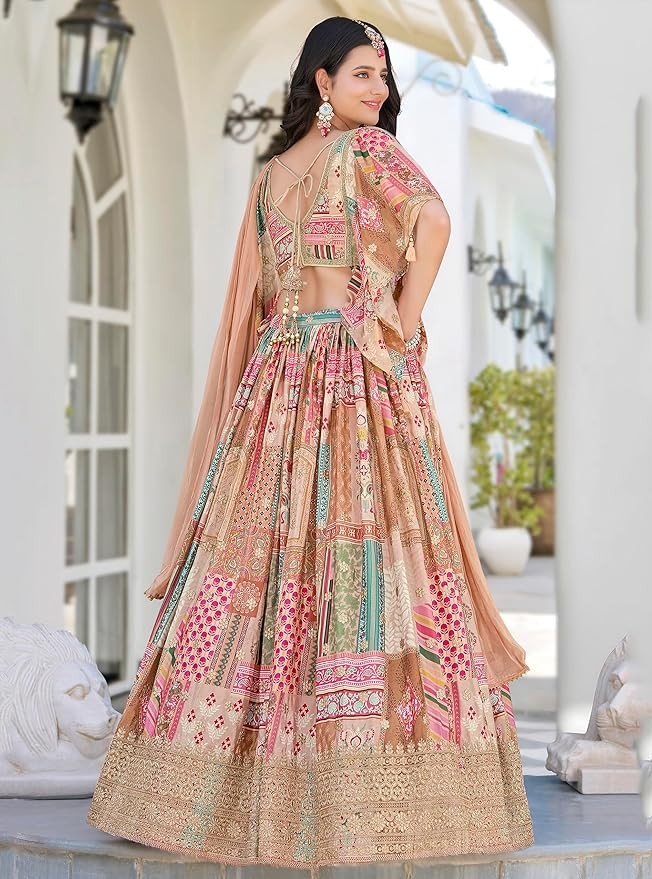 • Lehenga Work: Digital Print with Zari Dori Embroidery; Blouse Work: Digital Print with Zari Dori Embroidery; Dupatta Work: Digital Print with Zari Dori Embroidery
